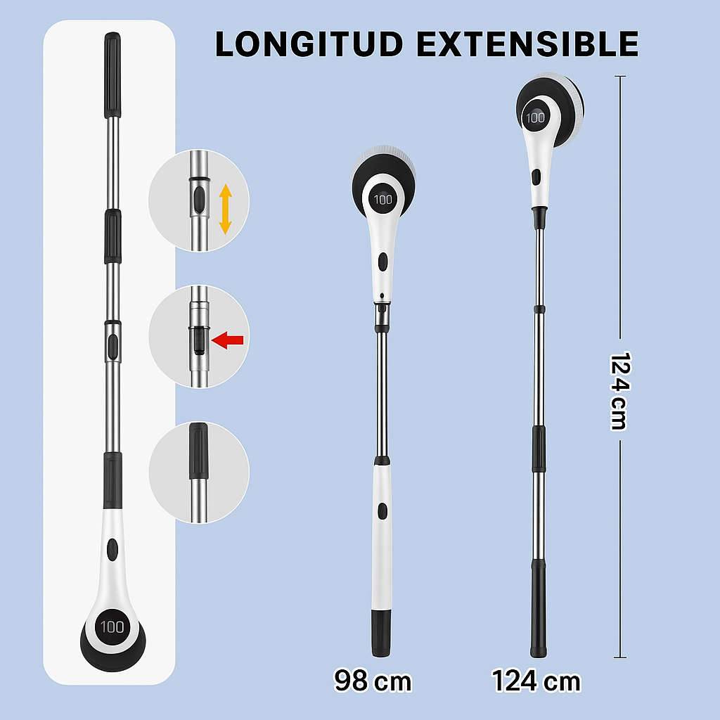 Este cepillo eléctrico incluye un brazo extensible para que limpies cómodamente sin dolor. Ideal para adultos mayores, personas con dolores lumbares o cualquiera que quiera cuidarse mientras mantiene su casa impecable.