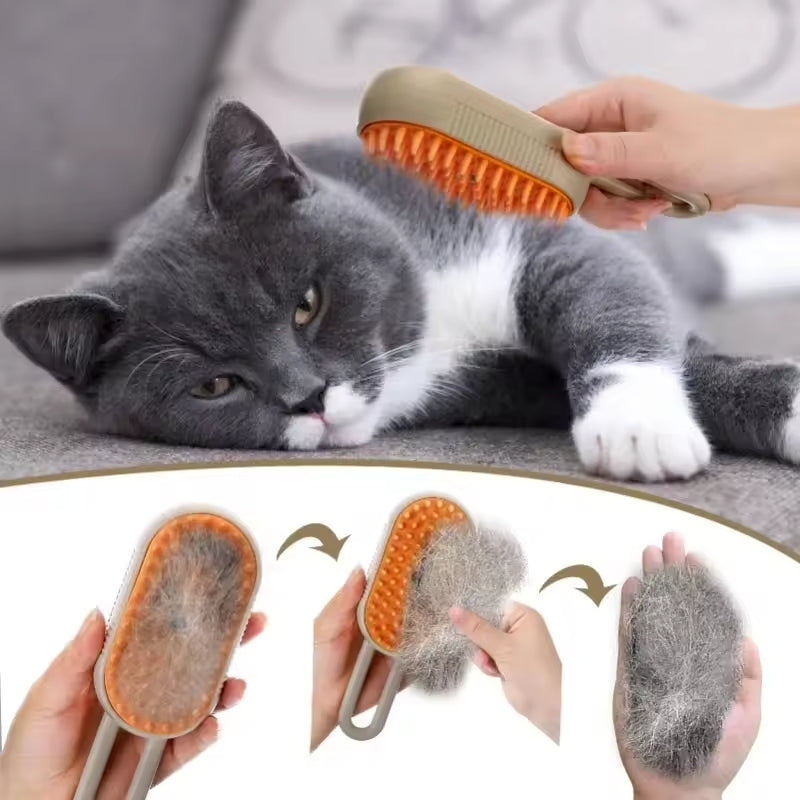 Este cepillo integra tres funciones esenciales: cepillado, masaje y vaporización, lo que permite eliminar pelos muertos, desenredar sin dolor y relajar a tu mascota al mismo tiempo